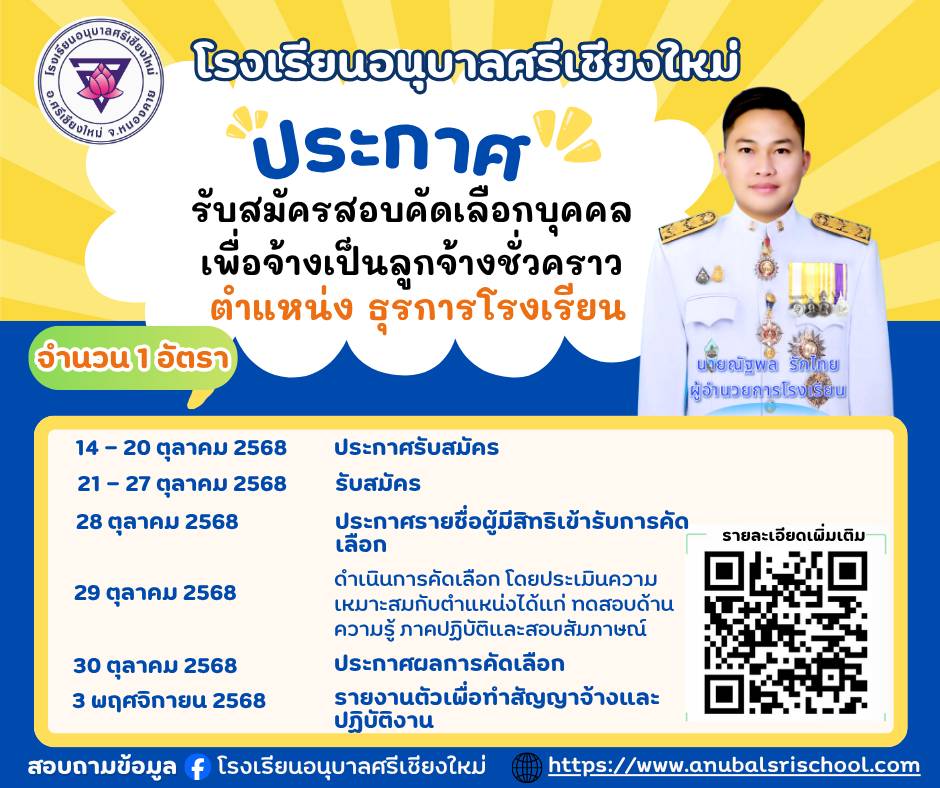 โรงเรียนอนุบาลศรีเชียงใหม่ รับสมัครคัดเลือกบุคคลเพื่อจ้างเหมาบริการเป็นลูกจ้างชั่วคราว ตำแหน่ง ธุรการโรงเรียน