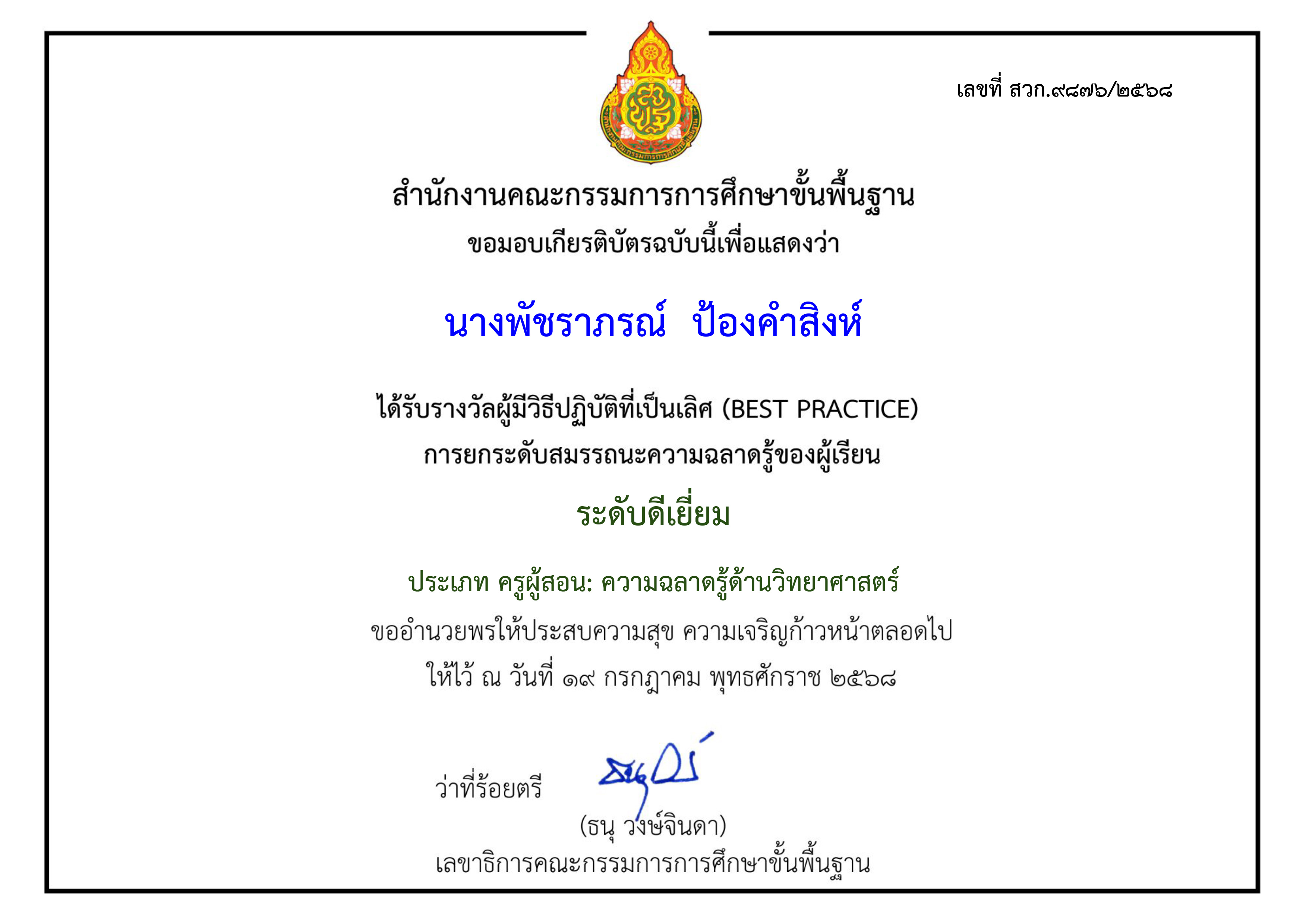 ผลงานระดับประเทศ ครูผู้มีผู้การปฏิบัติงานที่เป็นเลิศ Best Practice คุณครูพัชราภรณ์ ป้องคำสิงห์