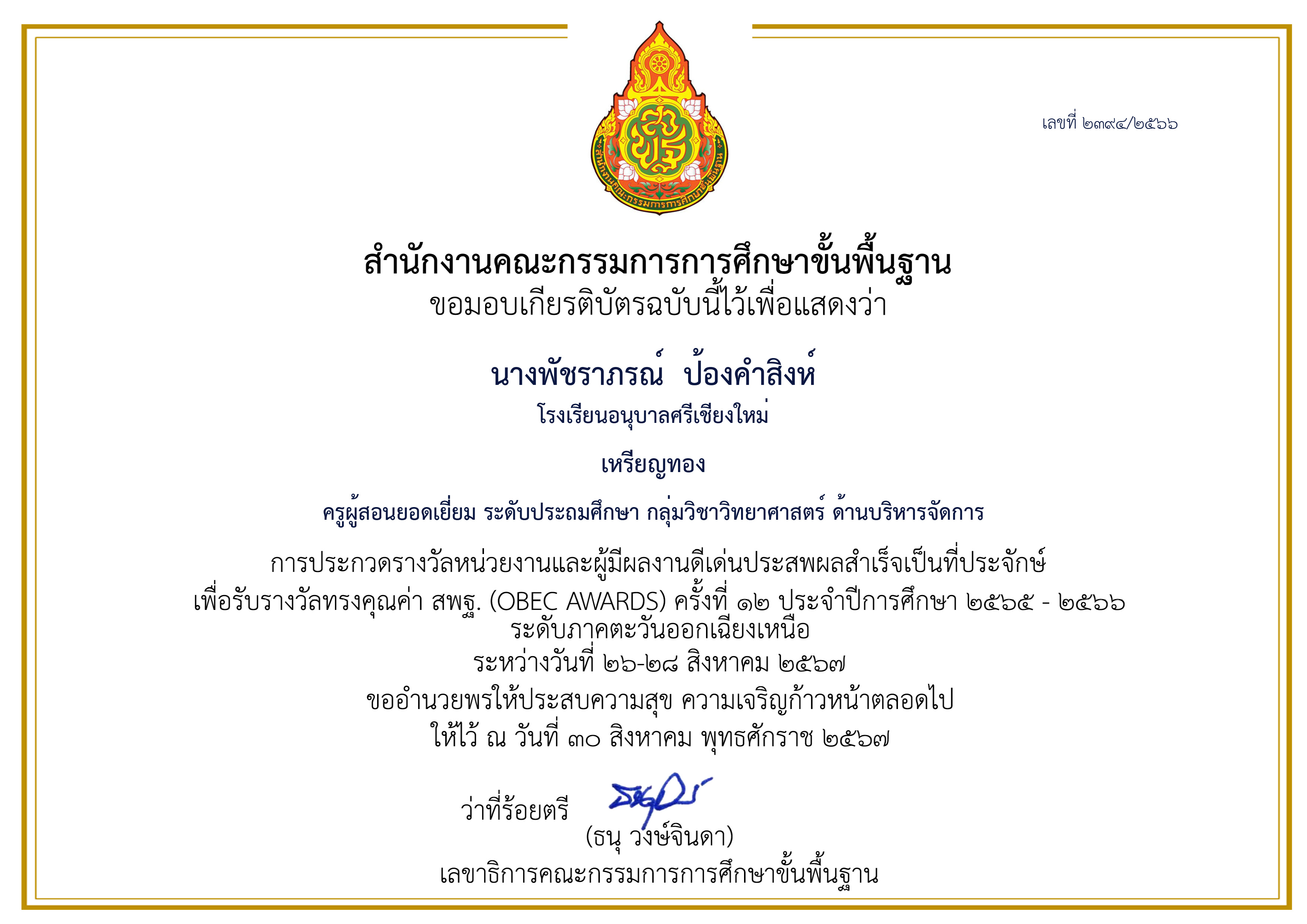 ผลงานระดับประเทศ ครูผู้สอนยอดเยี่ยม OBEC AWARDS ด้านกิจกรรมนักเรียน คุณครูพัชราภรณ์ ป้องคำสิงห์