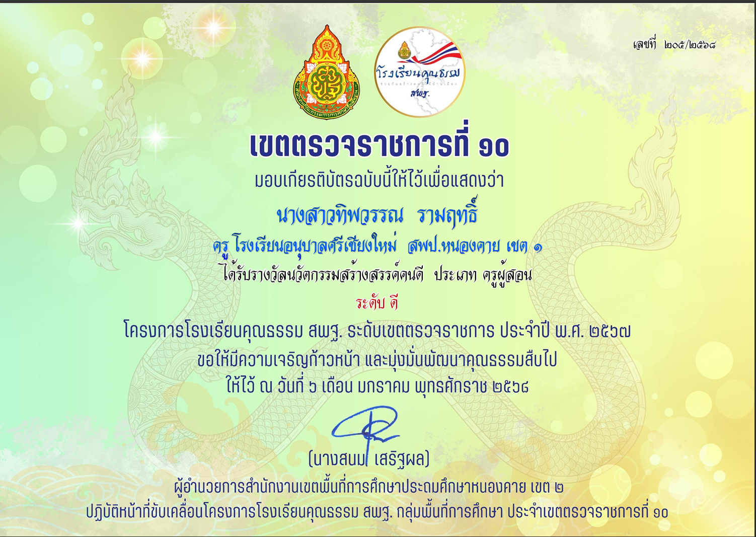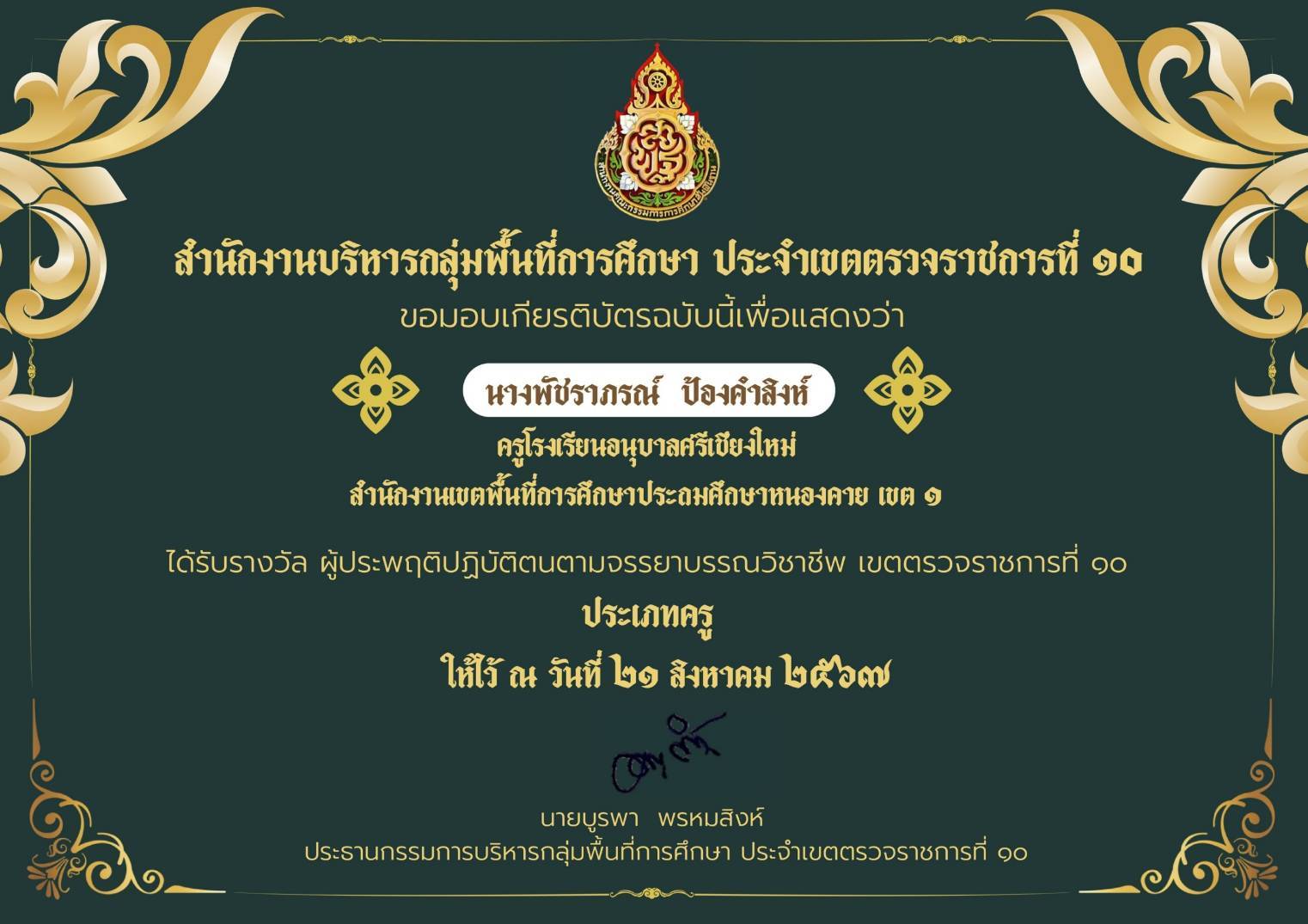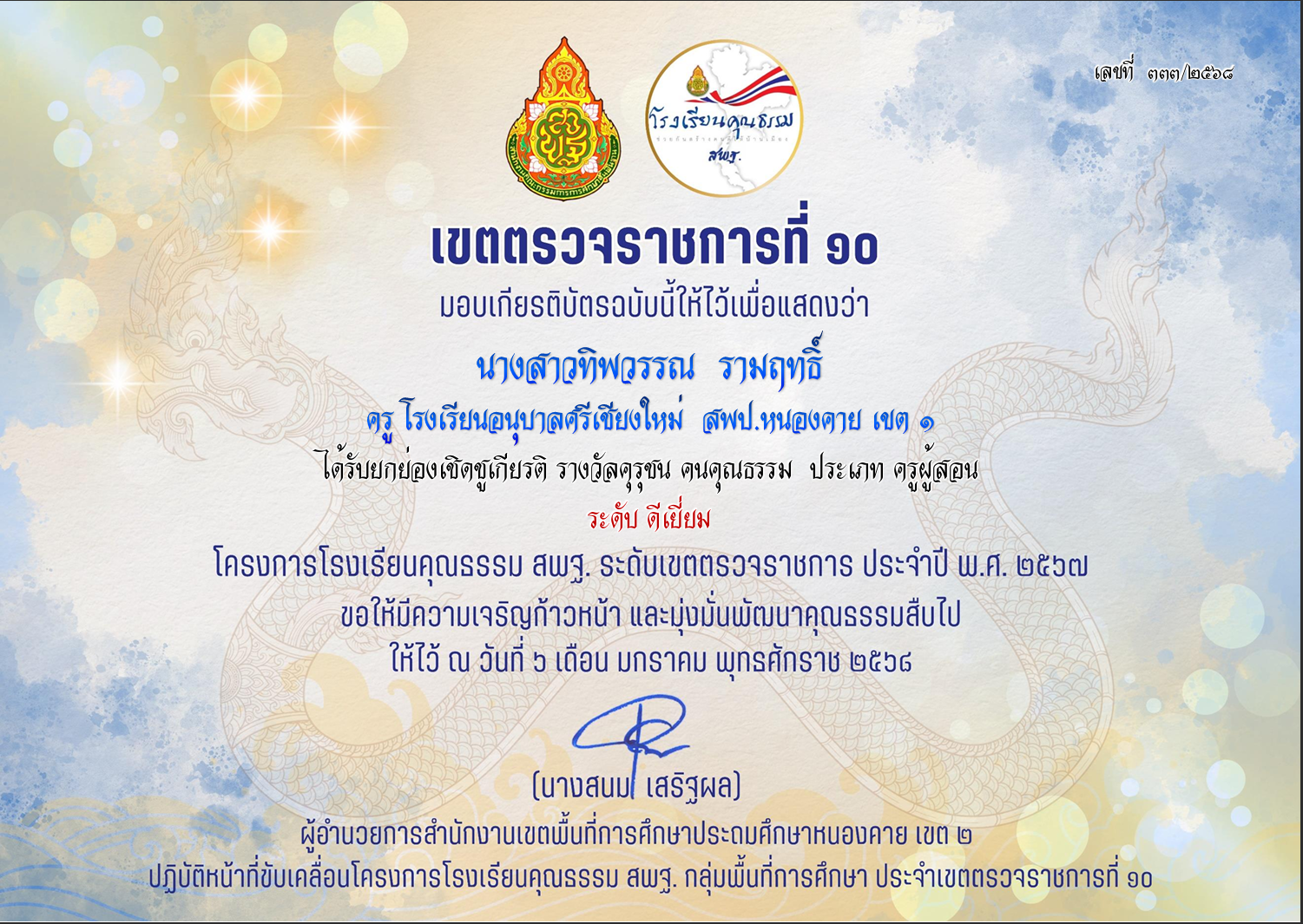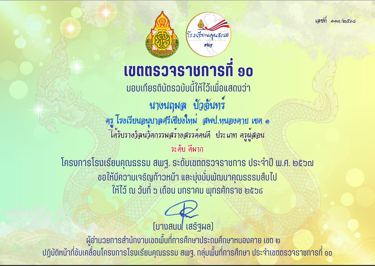 ผลงานเขตตรวจราชการที่10 ผู้ประพฤปฏิบัติตนตามจรรยาบรรณวิชาชีพ คุณครูพัชราภรณ์ ป้องคำสิงห์